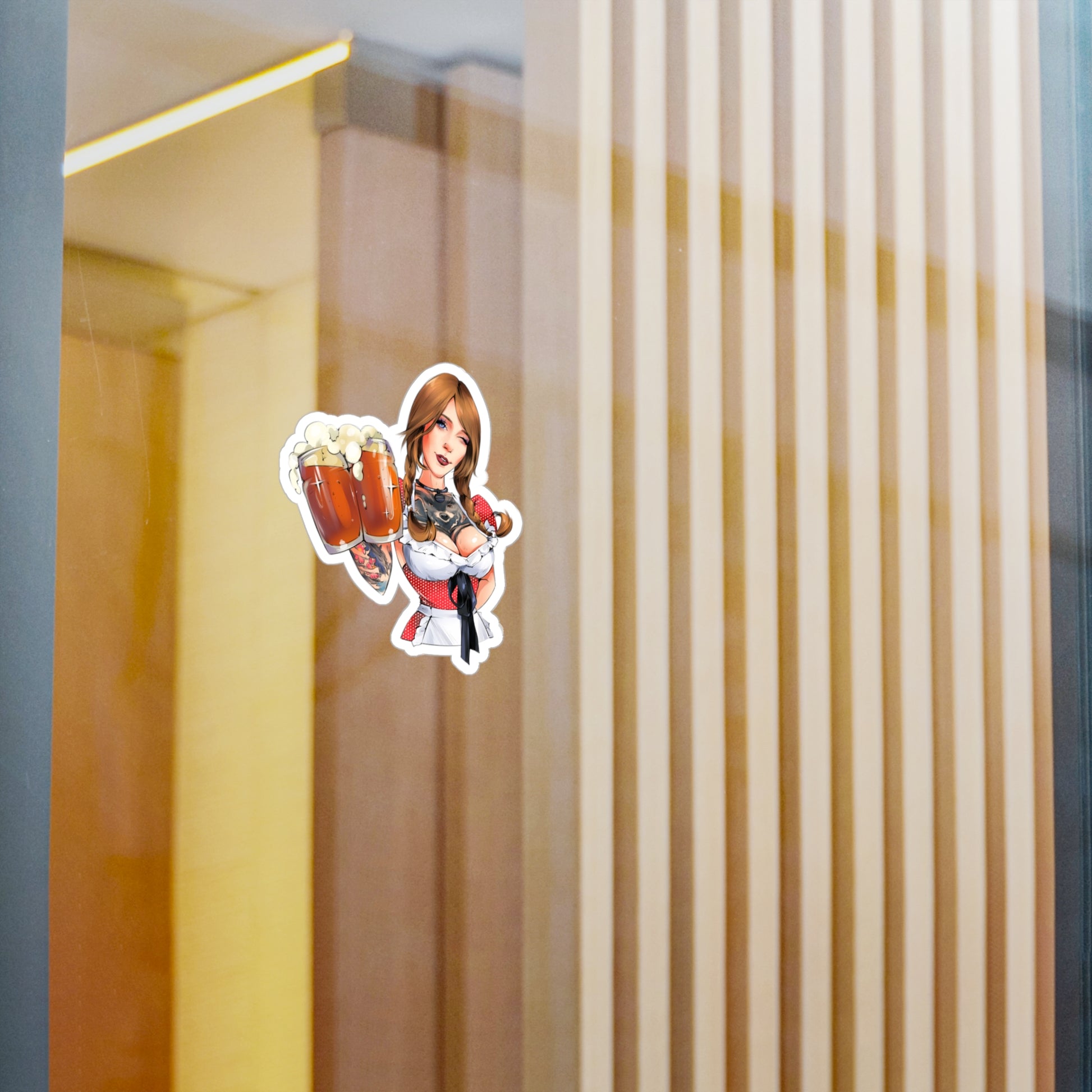 A lively, satin-finish kiss-cut vinyl decal featuring a playful, illustrated barmaid raising two foamy steins. The sticker’s crisp, vibrant colors and fine kiss-cut border let the artwork pop on laptops, tumblers, windows, and growlers. Built to handle outdoor use, the decal resists water, scratches, and UV fading so the bold reds and warm skin tones stay bright for up to three years. The removable adhesive peels away cleanly when you want to change the scene — a small barcode on the backing is the only giveaway that it came from the shop. Note: very close fine details (about 0.3"/3.2mm) may merge during cutting, and very light colors can show a slight grain from the print process.